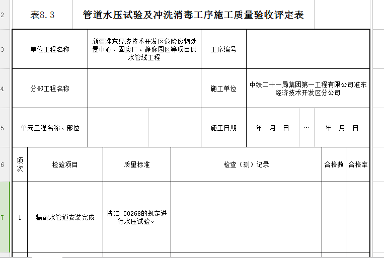 管道水壓試驗及沖洗消毒工序施工質(zhì)量驗收評定表
