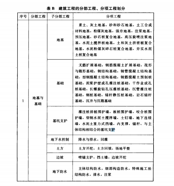 參考分部分項(xiàng)劃分表,現(xiàn)場(chǎng)涉及到的分項(xiàng)進(jìn)行統(tǒng)計(jì),參考GB50300-2013,地基與基礎(chǔ)分部劃分為: