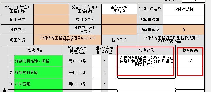 您好!鋼結(jié)構(gòu)專業(yè)里檢驗批批有18個。最好能明確一下具體哪個表。這樣回答才能有針對性。而且檢驗批都是描述性的項目,描述性的項目不管是主控項目還是一般項目,都需要根據(jù)檢查項目要求肯定性的填寫檢查結(jié)果,檢查結(jié)果會有下拉選項,一般選合格就行。