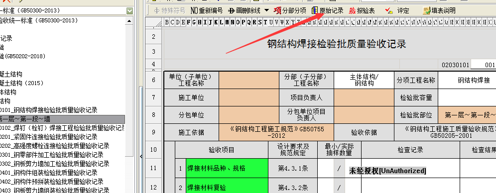 檢驗(yàn)批表頭上方有原始記錄的按鈕。