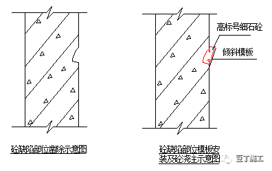 A、鑿除孔洞、夾渣等四周松散混凝土,根據(jù)缺陷深度將缺陷上口鑿成傾斜狀(便于混凝土澆注和振搗),如下示意圖所示: