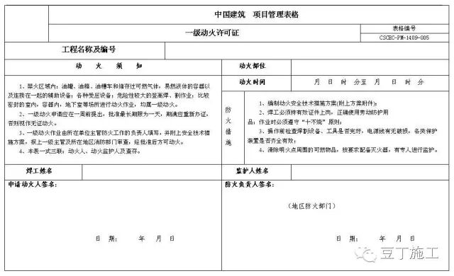 三級動火 | 1)在非固定的,無明顯危險因素的場所進行動火作業(yè)等均屬三級動火。 2)三級動火申請人應在三天前提出,批準最長期限為七天,期滿后應重新辦證,否則視作無證動火。 3)三級動火作業(yè)由所在班組填寫,經(jīng)本單位項目部施工負責人審查批準,方可動火。 |