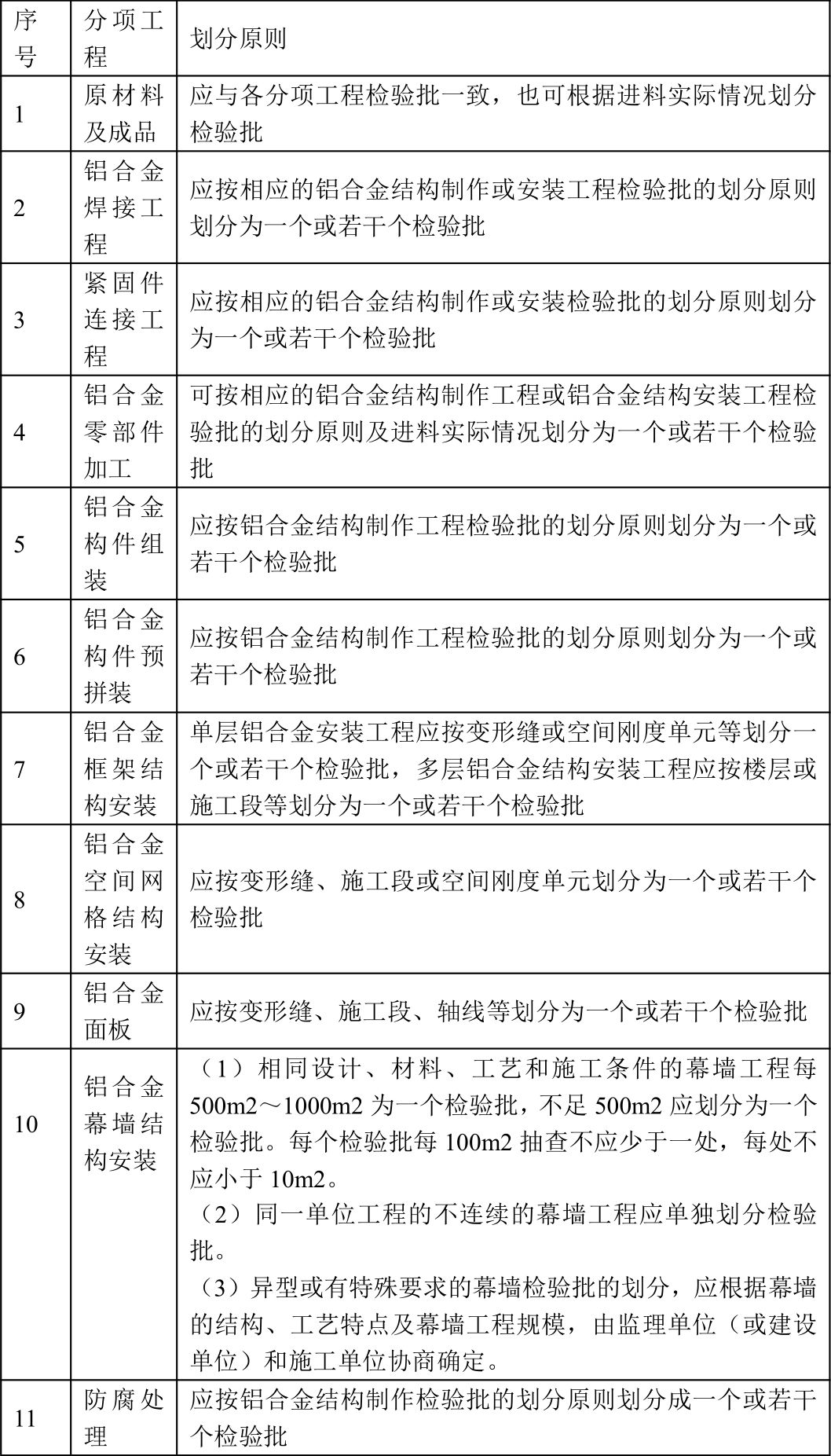 1 地基 1.1 檢驗(yàn)批的劃分 地基子分部可以按照基礎(chǔ)類型劃分為一個(gè)檢驗(yàn)批,如果工程量很大或者施工組織設(shè)計(jì)與專項(xiàng)施工方案中要求分段施工的,可以按照施工段劃分為若干個(gè)檢驗(yàn)批。 1.2 檢驗(yàn)批容量 檢驗(yàn)批容量可以按地基面積,復(fù)合地基可以按樁數(shù)。 1.3 最小抽樣數(shù)量 2 樁基 2.1 檢驗(yàn)批的劃分 樁可按樁類型和混凝土強(qiáng)度等級(jí)劃分為一個(gè)檢驗(yàn)批。 2.2 檢驗(yàn)批容量 樁基工程以按樁數(shù)。 2.3 最小抽樣數(shù)量 3 地下防水 3.1 檢驗(yàn)批的劃分 (1)主體結(jié)構(gòu)防水工程和細(xì)部構(gòu)造防水工程應(yīng)按結(jié)構(gòu)層、變形縫或后澆帶等施工段劃分檢驗(yàn)批; (2)特殊施工法結(jié)構(gòu)防水工程應(yīng)按隧道區(qū)間、變形縫等施工段劃分檢驗(yàn)批; (3)排水工程和注漿工程應(yīng)各為一個(gè)檢驗(yàn)批。 3.2 檢驗(yàn)批容量和最小抽樣數(shù)量 4 混凝土結(jié)構(gòu) 4.1 檢驗(yàn)批的劃分 各分項(xiàng)工程可根據(jù)與生產(chǎn)和施工方式相一致且便于控制施工質(zhì)量的原則,按進(jìn)場(chǎng)批次、工作班、樓層、結(jié)構(gòu)縫或施工段劃分為若干檢驗(yàn)批。 4.2 檢驗(yàn)批容量和最小抽樣數(shù)量 最小抽樣數(shù)量依據(jù)《混凝土結(jié)構(gòu)工程施工質(zhì)量驗(yàn)收規(guī)范》GB 50204-2015確定。 5 砌體結(jié)構(gòu) 5.1 檢驗(yàn)批的劃分 (1)所用材料類型及同類型材料的強(qiáng)度等級(jí)相同; (2)不超過250m3砌體; (3)主體結(jié)構(gòu)砌體一個(gè)樓層(基礎(chǔ)砌體可按一個(gè)樓層計(jì));填充墻砌體量少時(shí)可多個(gè)樓層合并。 5.2 檢驗(yàn)批容量 砌筑的立方量 5.3 最小抽樣數(shù)量 砌體結(jié)構(gòu)分項(xiàng)工程中檢驗(yàn)批抽檢時(shí),各抽檢項(xiàng)目的樣本最小容量除有特殊要求外,按不應(yīng)少于5確定。 6 鋼結(jié)構(gòu) 6.1 檢驗(yàn)批的劃分 6.2 最小抽樣數(shù)量 依據(jù)《鋼結(jié)構(gòu)工程施工質(zhì)量驗(yàn)收規(guī)范》GB 50205-2001確定。 7 鋼管混凝土結(jié)構(gòu)及型鋼混凝土結(jié)構(gòu) 7.1 檢驗(yàn)批的劃分 可參照混凝土和鋼結(jié)構(gòu)的劃分原則 7.2 最小抽樣數(shù)量 鋼管混凝土結(jié)構(gòu)依據(jù)《鋼管混凝土工程施工質(zhì)量驗(yàn)收規(guī)范》GB 50628-2010確定;型鋼混凝土結(jié)構(gòu)可依據(jù)《鋼-混凝土組合結(jié)構(gòu)施工規(guī)范》GB50901-2013確定。 8 鋁合金結(jié)構(gòu) 8.1 檢驗(yàn)批的劃分 8.2 最小抽樣數(shù)量 按《鋁合金結(jié)構(gòu)工程施工質(zhì)量驗(yàn)收規(guī)范》GB 50576-2010確定。 9 木結(jié)構(gòu) 9.1 檢驗(yàn)批的劃分 9.2 最小抽樣數(shù)量 按《木結(jié)構(gòu)工程施工質(zhì)量驗(yàn)收規(guī)范》GB 50206-2012確定。 10 建筑地面 10.1 檢驗(yàn)批的劃分 應(yīng)按每一層次或每層施工段(或變形縫)劃分檢驗(yàn)批,高層建筑的標(biāo)準(zhǔn)層可按每三層(不足三層按三層計(jì))劃分檢驗(yàn)批。 10.2 最小抽樣數(shù)量 抽查數(shù)量應(yīng)隨機(jī)檢驗(yàn)不應(yīng)少于3間;不足3間,應(yīng)全數(shù)檢查;有防水要求的建筑地面子分部工程的分項(xiàng)工程施工質(zhì)量每檢驗(yàn)批抽查數(shù)量應(yīng)按其房間總數(shù)隨機(jī)檢驗(yàn)不應(yīng)少于4間,不足4間,應(yīng)全數(shù)檢查。 10.3 檢驗(yàn)批容量 按自然間(或標(biāo)準(zhǔn)間),其中走廊(過道)應(yīng)以10延長(zhǎng)米為1間,工業(yè)廠房(按單跨計(jì))、禮堂、門廳應(yīng)以兩個(gè)軸線為1間計(jì)。 11 抹灰 11.1 檢驗(yàn)批劃分 (1)相同材料工藝和施工條件的室外抹灰工程每500~1000㎡應(yīng)劃分為一個(gè)檢驗(yàn)批,不足500㎡也應(yīng)劃分為一個(gè)檢驗(yàn)批。 (2)相同材料工藝和施工條件的室內(nèi)抹灰工程每50 個(gè)自然間(大面積房間和走廊按抹灰面積30㎡為一間)應(yīng)劃分為一個(gè)檢驗(yàn)批,不足50間也應(yīng)劃分為一個(gè)檢驗(yàn)批。 11.2 最小抽樣數(shù)量 (1)室內(nèi)每個(gè)檢驗(yàn)批應(yīng)至少抽查10%,并不得少于3 間;不足3 間時(shí)應(yīng)全數(shù)檢查。 (2)室外每個(gè)檢驗(yàn)批每100㎡應(yīng)至少抽查一處,每處不得小于10㎡。 11.3 檢驗(yàn)批容量 室內(nèi)抹灰按自然間(或標(biāo)準(zhǔn)間),室外抹灰按面積。 12 外墻防水 12.1 檢驗(yàn)批劃分 應(yīng)按照外墻面面積500㎡~1000㎡為一個(gè)檢驗(yàn),不足500㎡時(shí)也應(yīng)劃分為一個(gè)檢驗(yàn)批。 12.2 最小抽樣數(shù)量 每個(gè)檢驗(yàn)批每100㎡應(yīng)至少抽查一處,每處不得小于10㎡,且不得少于3處;節(jié)點(diǎn)構(gòu)造應(yīng)全部進(jìn)行檢查。 12.3 檢驗(yàn)批容量 按外墻面面積。 13 門窗 13.1 檢驗(yàn)批的劃分 (1)同一品種、類型和規(guī)格的木門窗、金屬門窗、塑料門窗及門窗玻璃每100 樘應(yīng)劃分為一個(gè)檢驗(yàn)批,不足100 樘也應(yīng)劃分為一個(gè)檢驗(yàn)批。 (2)同一品種、類型和規(guī)格的特種門每50 樘應(yīng)劃分為一個(gè)檢驗(yàn)批,不足50 樘也應(yīng)劃分為一個(gè)檢驗(yàn)批。 13.2 最小抽樣數(shù)量 (1)木門窗、金屬門窗、塑料門窗及門窗玻璃,每個(gè)檢驗(yàn)批應(yīng)至少抽查5%,并不得少于3 樘,不足3 樘時(shí)應(yīng)全數(shù)檢查;高層建筑